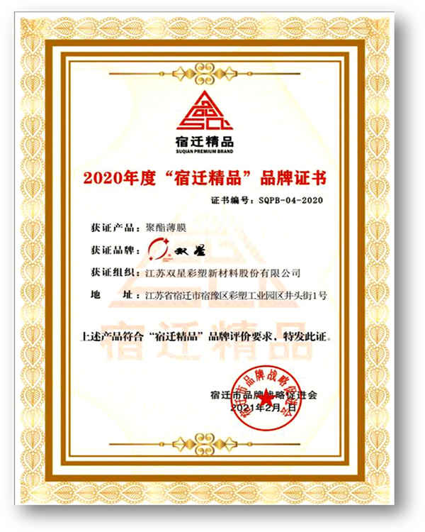 Recently, we learned from the list of "Suqian Boutique" brand certified enterprises in 2020 released by Suqian Market Supervision and Administration Bureau and Suqian Brand Strategy Promotion Association that "Shuangxing" brand polyester film of Jiangsu Shuangxing Color Plastic New Material Co., Ltd. won the brand certification award.