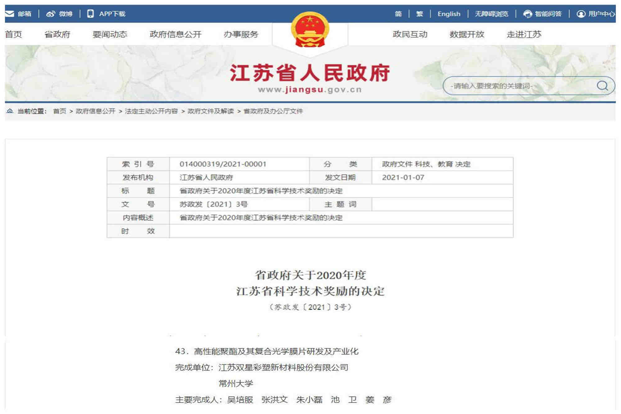 Recently, the People's Government of Jiangsu Province issued the Provincial Government's Decision on 2020 Jiangsu Science and Technology Awards (SZF [2021] No. 3). The scientific research project "Research and Development and Industrialization of High Performance Polyester and Its Composite Optical Film" hosted by the company won the 2020 Jiangsu Science and Technology Award.