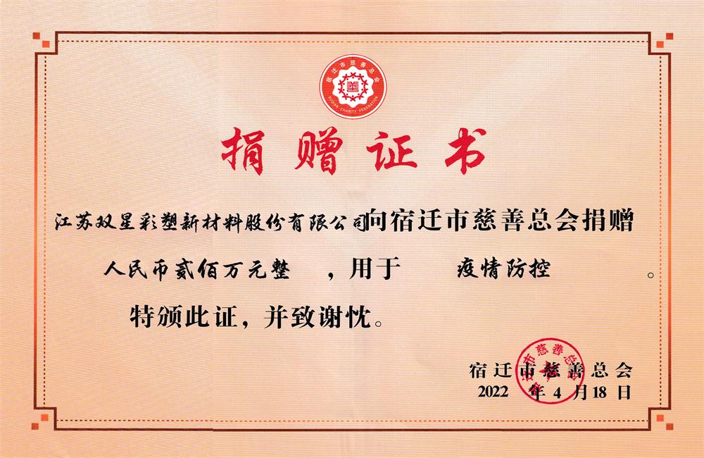 Recently, the central urban area of Suqian has turned to the stage of normalized epidemic prevention and control, realizing "liberalization" on the basis of "control", and quickly restoring the normal order of economic operation. The four functional areas such as Suqian Economic and Technological Development Zone are the main battlefields for the resumption of production. Double Star New Materials attached great importance to it and actively responded to the government's call. On April 18, Double Star New Materials donated 2 million yuan to Suqian Charity Federation, which was dedicated to the normalization of epidemic prevention and control in the "four functional areas" and the purchase of epidemic prevention materials by key hospitals in the central urban area. Consolidate the anti epidemic achievements, help the resumption of work and production, fully support the anti epidemic work, and contribute to winning the war. It is believed that with the help of Double Star New Material and all caring people, the whole people will work together with one heart and one mind, and the epidemic situation will surely become a thing of the past as soon as possible.