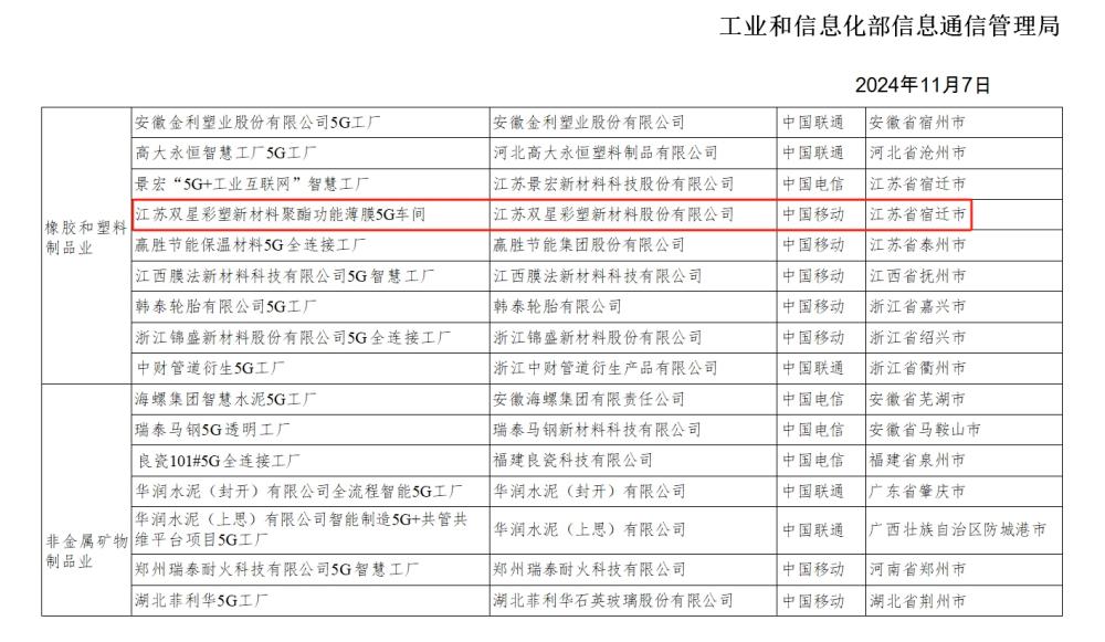 Double Star New Materials has been selected for the national "2024 5G Factory Directory".