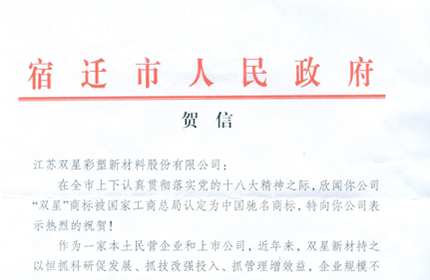 A congratulatory letter from Suqian Municipal People's Government