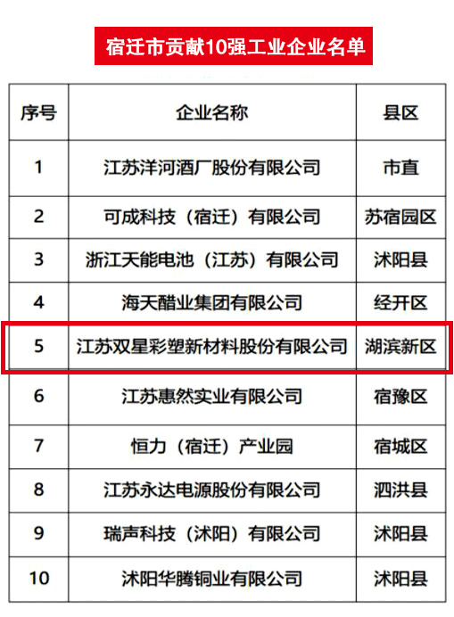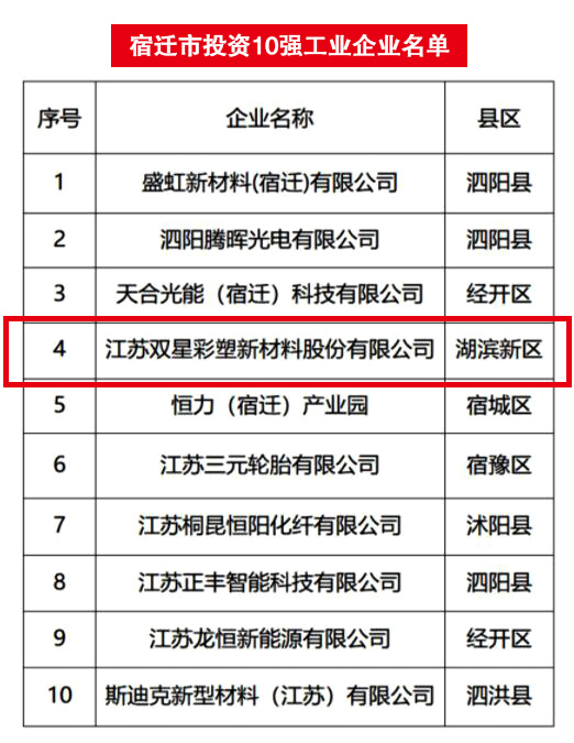 2022年2月18日,全市加快工業(yè)經(jīng)濟(jì)高質(zhì)量發(fā)展暨招商引資大會(huì)上,公布了2021年度“宿遷市貢獻(xiàn)10強(qiáng)、投資10強(qiáng)、銷售10強(qiáng)”工業(yè)企業(yè)名單,雙星新材喜獲“貢獻(xiàn)10強(qiáng)位列第5名、投資10強(qiáng)位列第4名、銷售10強(qiáng)位列第7名”。