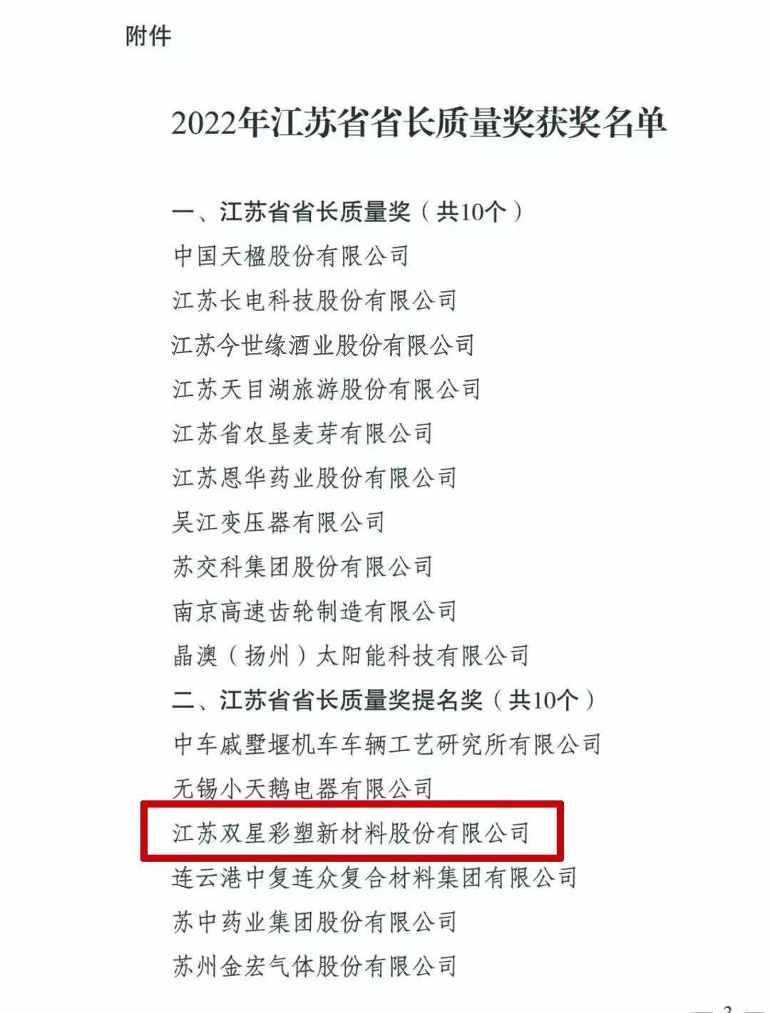 日前《省政府關(guān)于授予2022年江蘇省省長(zhǎng)質(zhì)量獎(jiǎng)的決定》(蘇政發(fā)〔2022〕84號(hào))正式印發(fā),江蘇雙星彩塑新材料股份有限公司榮獲江蘇省省長(zhǎng)質(zhì)量獎(jiǎng)提名獎(jiǎng),成為宿遷市獨(dú)家獲此殊榮的企業(yè)。