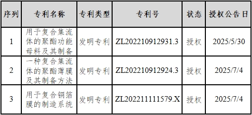 近日,獲悉國(guó)家知識(shí)產(chǎn)權(quán)局信息顯示,江蘇雙星彩塑新材料股份有限公司取得3項(xiàng)復(fù)合集流體材料發(fā)明專利獲批授權(quán)。