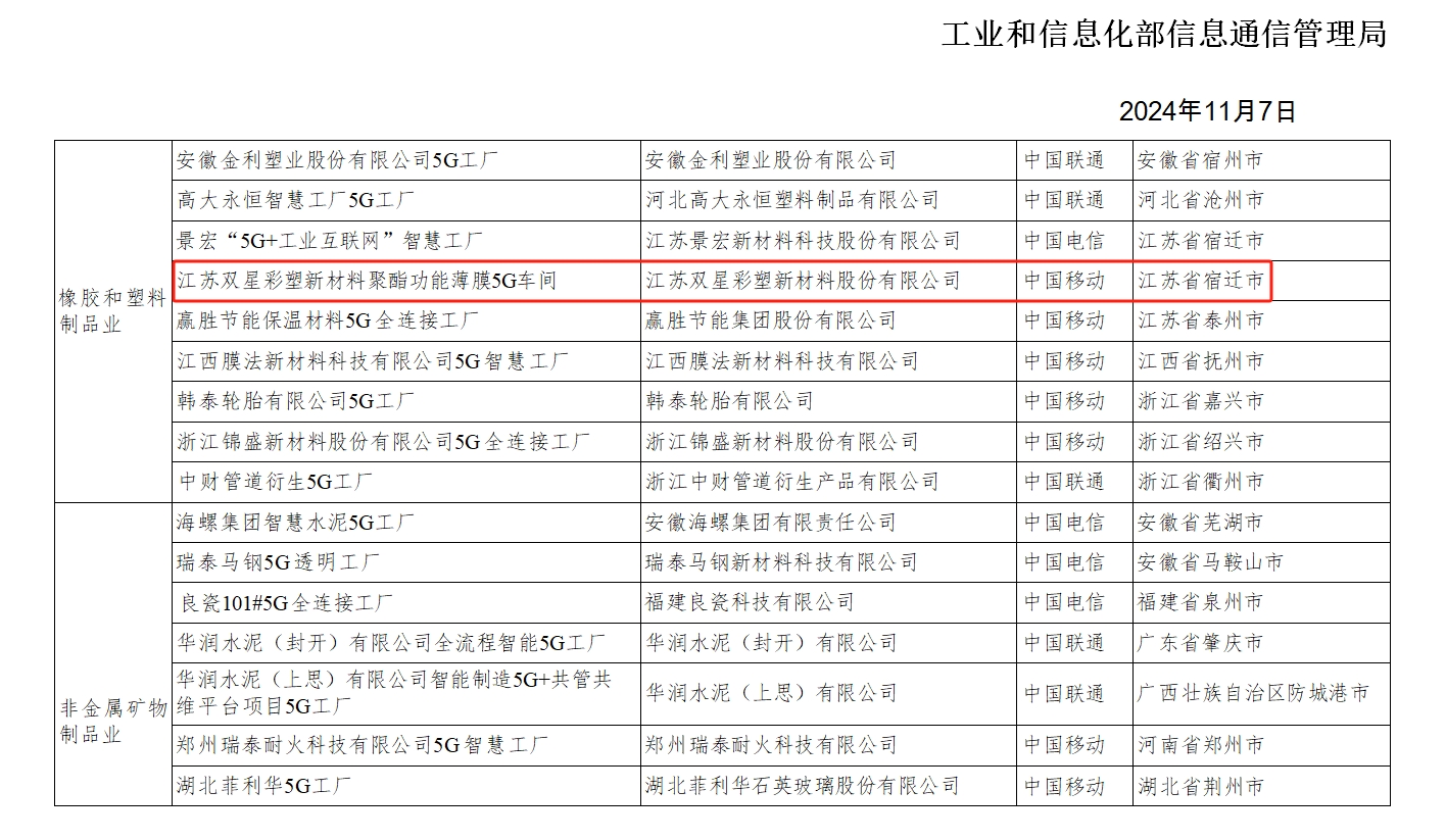 雙星新材入選國家級《2024年5G工廠名錄》